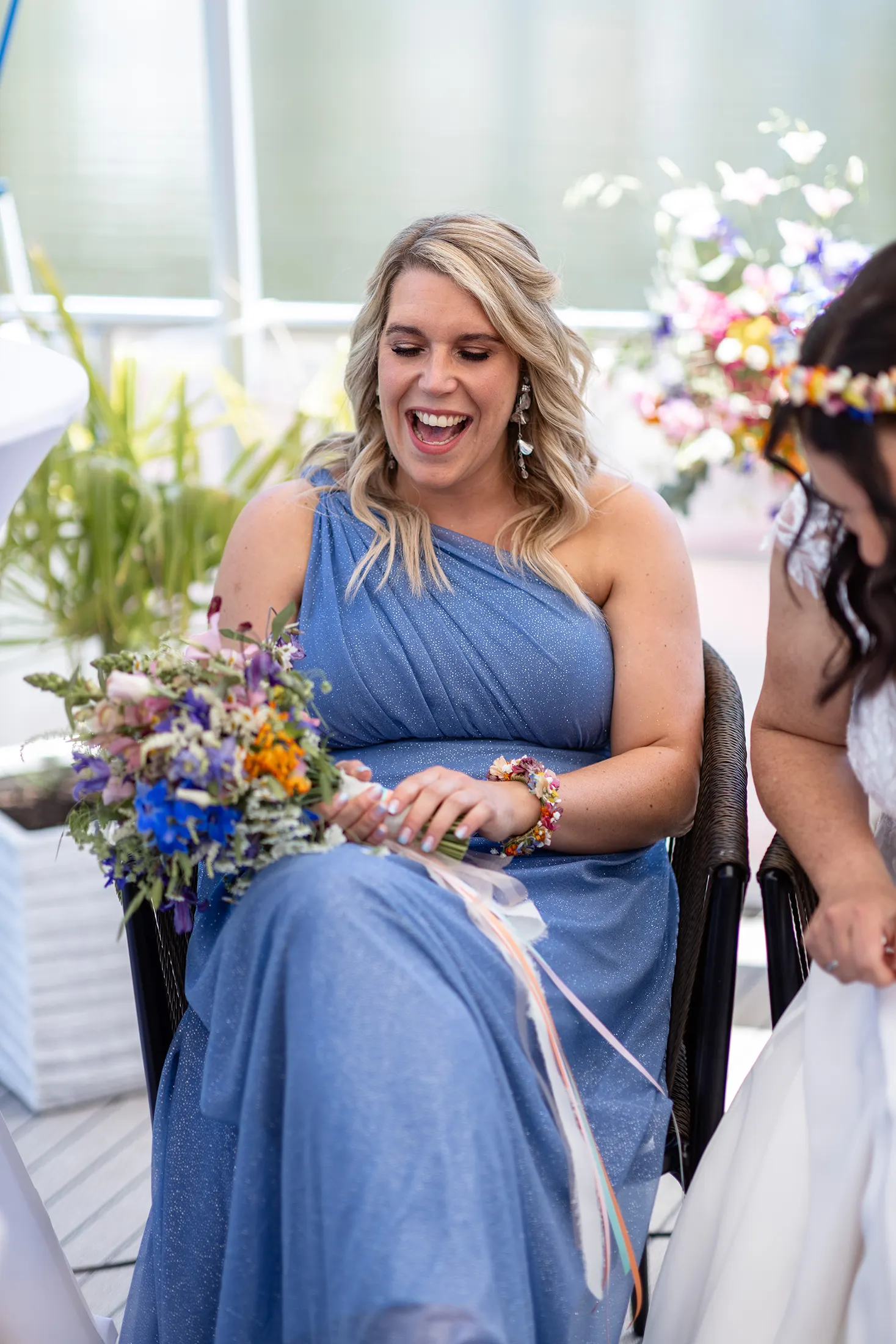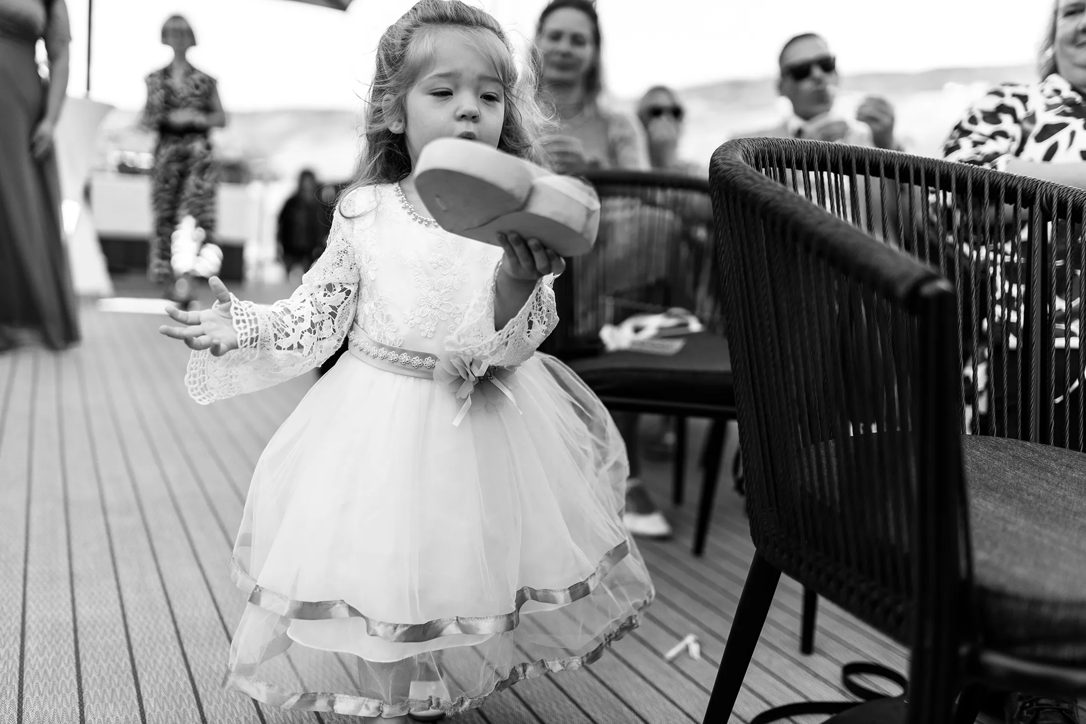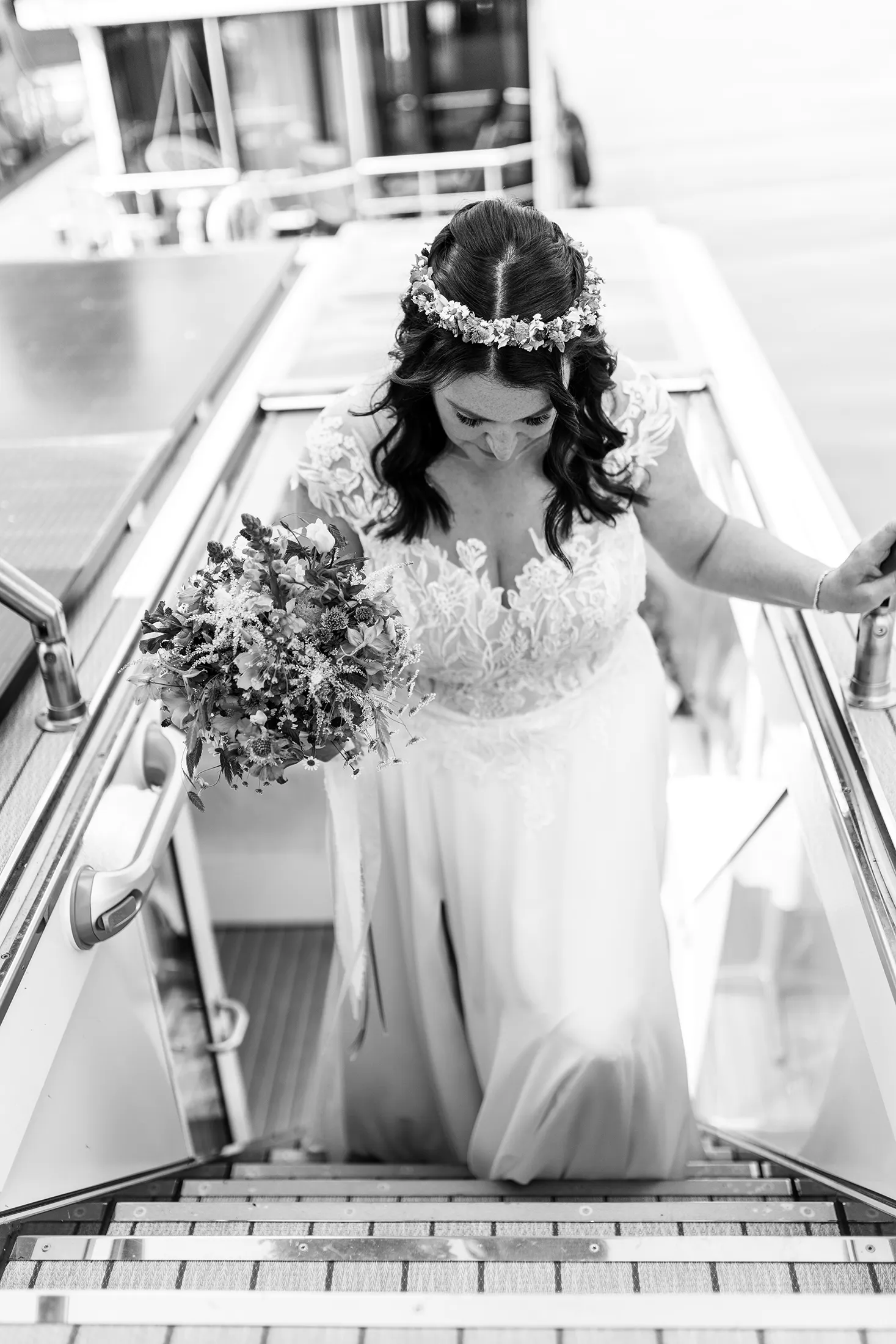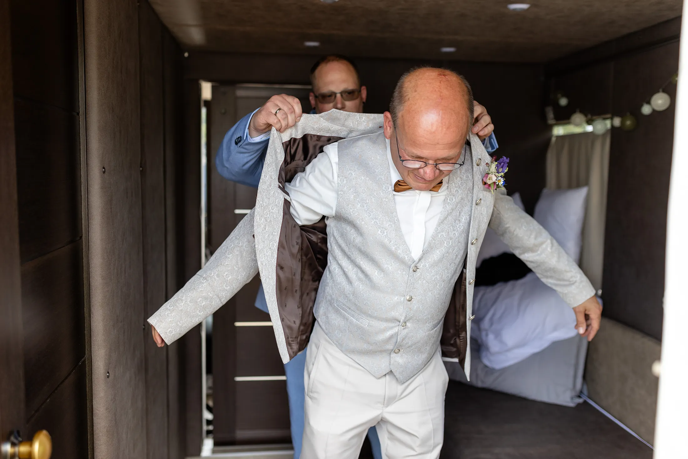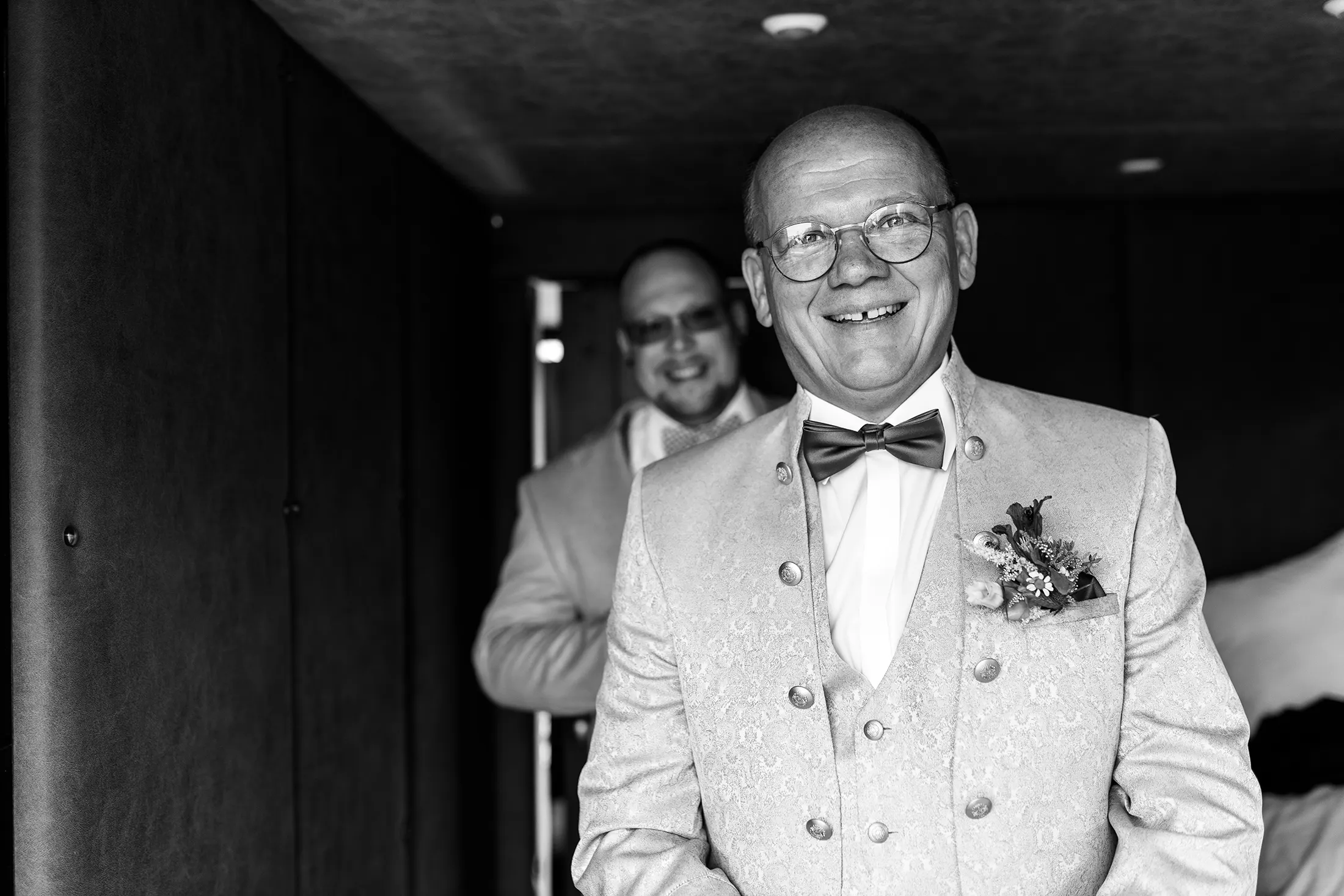 Der Tag begann mit dem Getting Ready von Gudrun im Hotel. Es waren nur ihre Tochter, ihr Hund und natürlich ihre Stylistin/Make-up Artist dabei. Eine entspannte, fröhliche Runde, in der schon viel gelacht wurde. Das Übliche: Make-up, Haare machen, Kleid anziehen mit Hilfe der Trauzeugin und letzte Vorbereitungen, bevor es zur Trauung geht. Parallel dazu machte sich Timo auf einem kleinen, aber feinen Boot direkt neben dem Party-Boot fertig. Kurz bevor es losging, konnte ich noch ein paar Aufnahmen von ihm machen, ehe der First Look anstand und Timo seine Gudrun zum ersten Mal als Braut sehen durfte. Ein sehr emotionaler Moment zwischen den beiden!