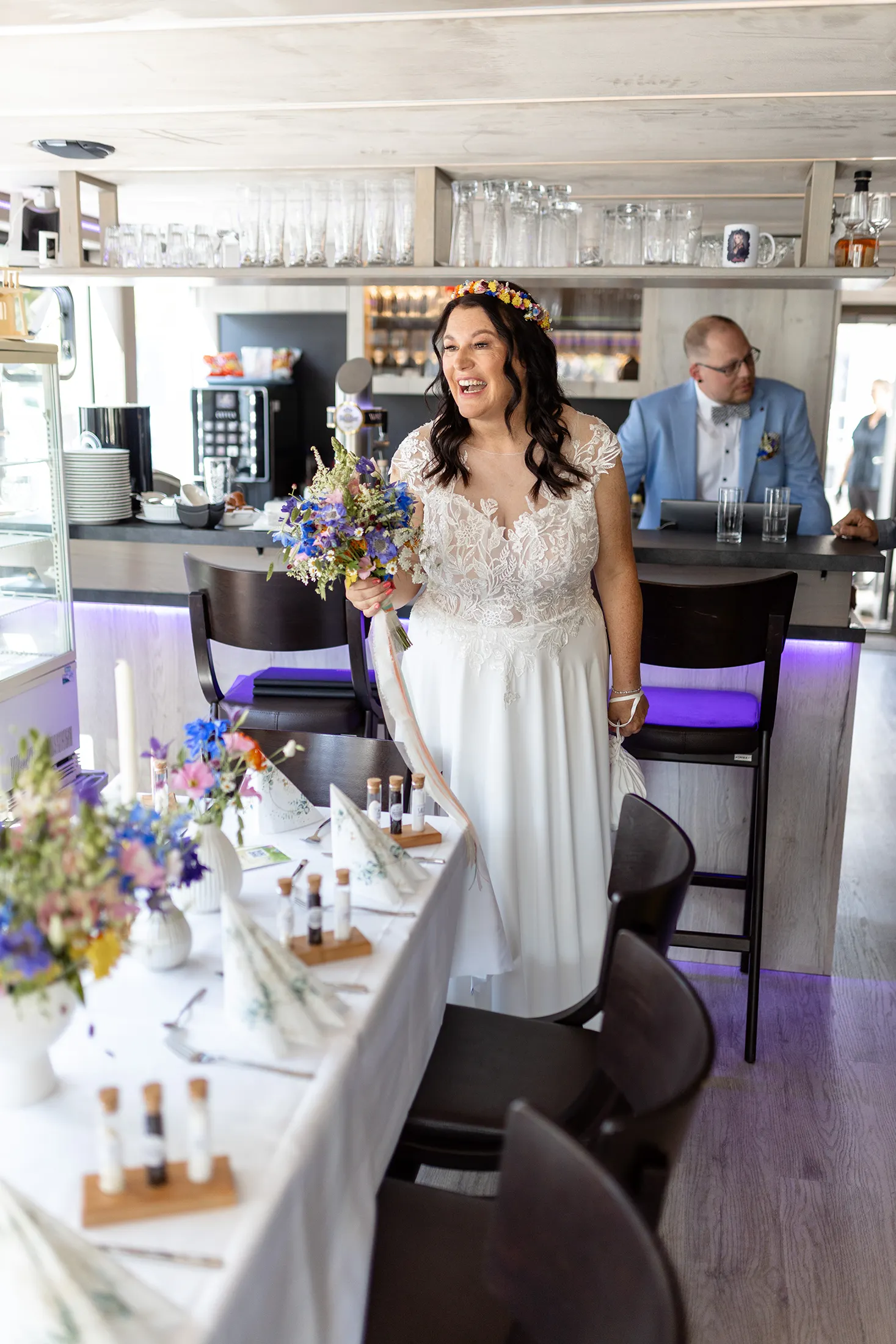 Zurück beim Boot haben wir schnell ein kleines Brautpaarshooting direkt um die Ecke auf dem Radweg abgehalten, bevor es zum Essen ging. Das Licht war gerade gut und manchmal muss man gar nicht weit von der Location weg. Der Radweg bot uns schöne Möglichkeiten für das Brautpaar-Shooting. Anschließend gab es noch den Torten-Anschnitt und selbstverständlich die Eröffnung der Tanzfläche durch das Brautpaar!