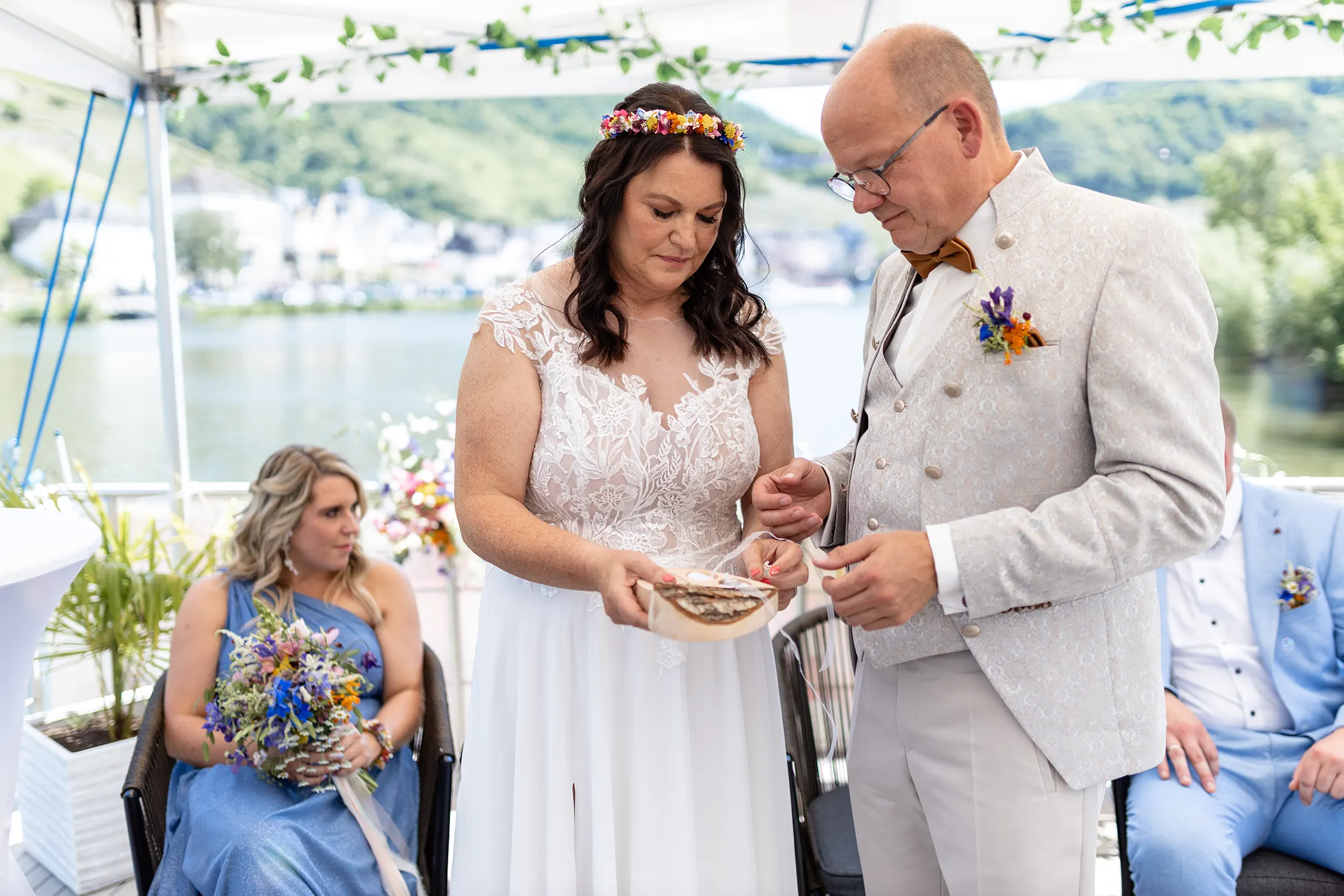 Die Hochzeit von Gudrun und Timo war eine sehr schöne Hochzeit und etwas Besonderes – nicht zuletzt wegen der außergewöhnlichen Location und der Rundfahrt in den T-1 Bussen durch die Weinberge! Die beiden haben sich in Bernkastel-Kues auf dem Eventboot Lagune das Ja-Wort gegeben. Eine freie Trauung mitten auf der Mosel, bei schönstem Wetter.