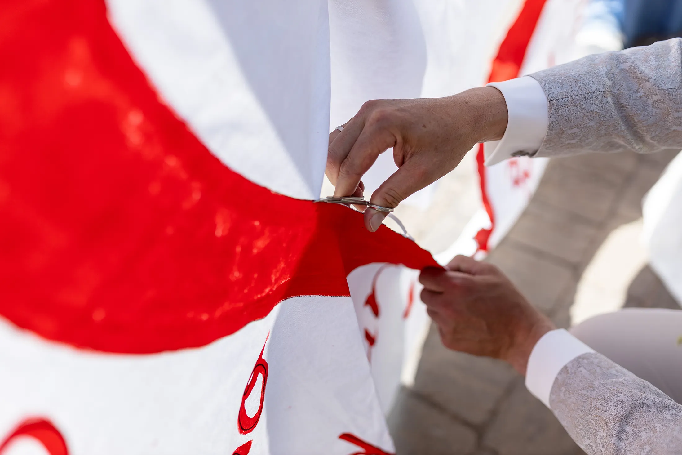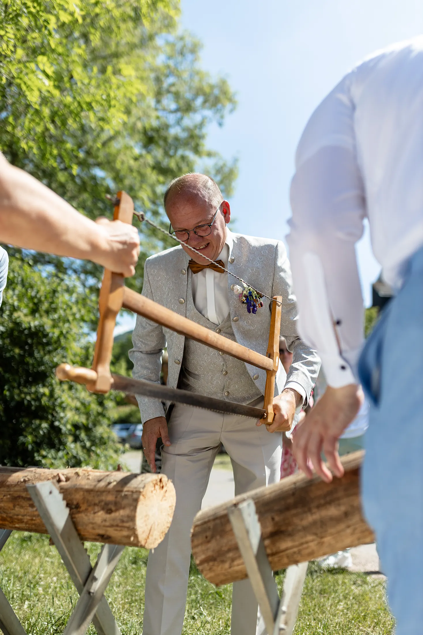 Die freie Trauung fand auf dem obersten Deck des Event-Bootes statt. Das habe ich bisher auch noch nie gehabt: Das Brautpaar saß mit dem Gesicht zu den Gästen. Es war den beiden eben sehr wichtig die Hochzeit MIT ihren Gästen zu erleben! Eine neue Perspektive und eine schöne Idee, wie ich finde. Nach den Gratulationen folgte die klassische Aufgabe: Holzstamm sägen – und natürlich haben die beiden das gemeinsam gemeistert. Nach ca. 5 Minuten Anstrengung war der Stamm dann auch durchgesägt und die beiden konnten zur nächsten Aufgabe voranschreiten: das klassische Bettlaken durchschneiden! Auch hier machten beide ein gute Figur und man sieht auf den Bildern, den Spaß, den sie dabei hatten.