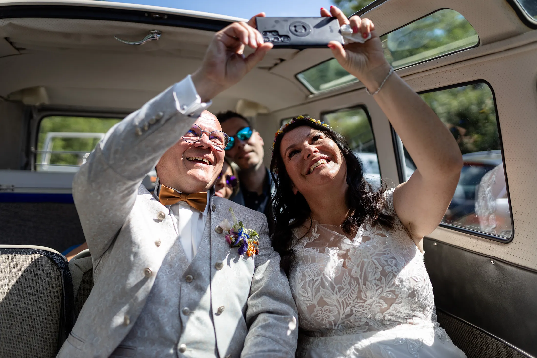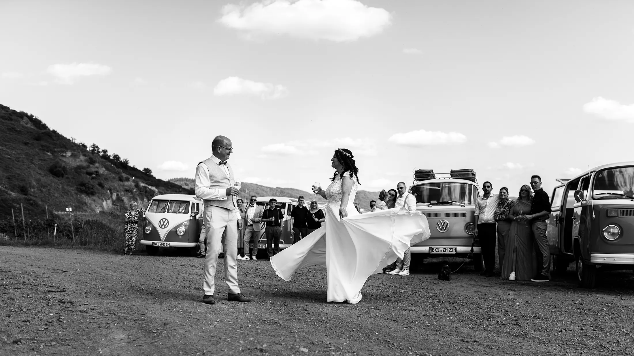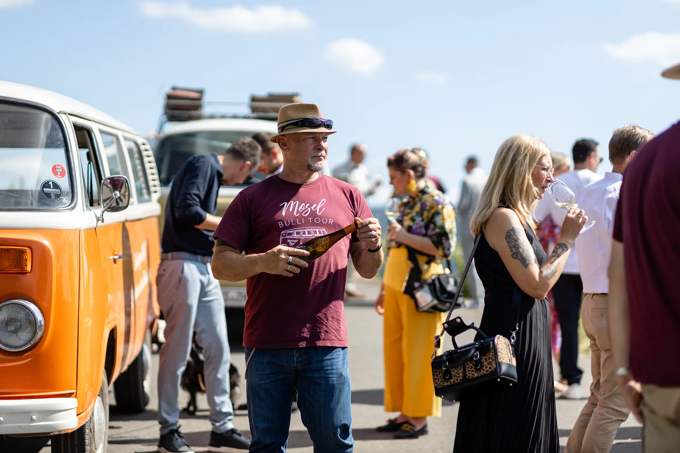 Doch der Tag hatte noch ein zweites Highlight parat. Nach der Trauung ging es zu einer Weinprobe in die traumhaften Weinberge von Bernkastel. Der Clou: Mehrere Volkswagen T1 Busse standen bereit und fuhren die komplette Gesellschaft von Station zu Station. Anhalten, Wein probieren, weiterfahren – eine entspannte Tour voller Genuss und guter Laune. In den Weinbergen nutzten wir noch einen bekannten Aussichtspunkt, um einige schöne Gruppenfotos von der Familie zu machen.